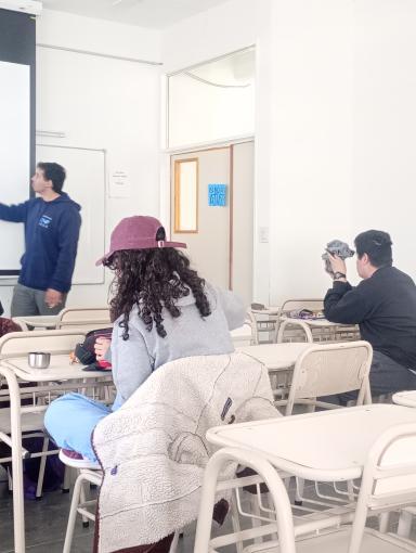 2025. 15/05 - Charla Evolución de los Dinosaurios en la escuela Las Calandrias por Lic. Javier González Dionis y Lic. Emanuel Seculi Pereyra invitados por la Dra. Teresa Dozo. Actividad educativa en aula que acerca la paleontología a la comunidad escolar, con énfasis en evidencia fósil, reconstrucciones y ciencia en Patagonia.
