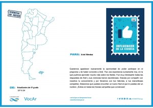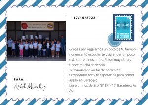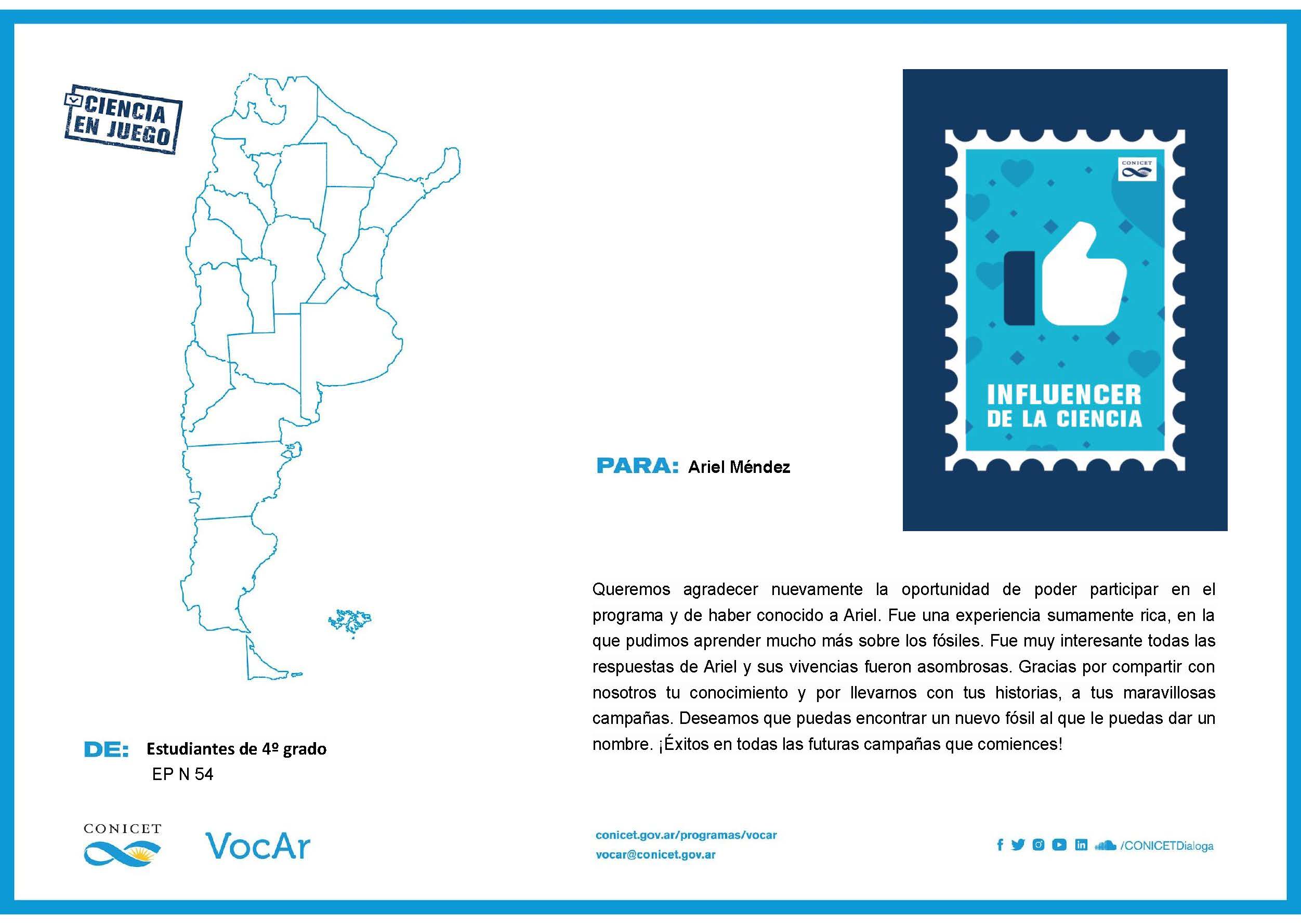 2022. Programa VocAr, Ciencia en Juego con el Dr. Ariel H. Méndez. En esta actividad las escuelas 3ro "B" EP Nº7 de Baradero y EP Nº 54 (Buenos Aires) conocieron la labor paleontológica y los fósiles de argentina.
